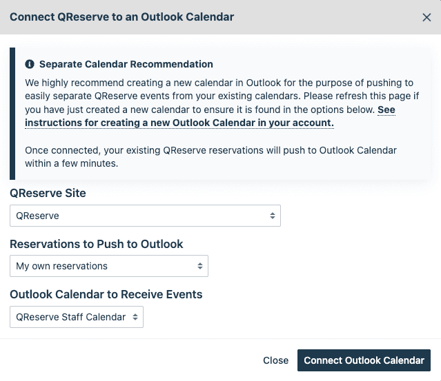 You can choose which of your QReserve site memberships will integrate with Outlook Calendar as well as which Outlook Calendar events will be pushed into. We highly recommend creating a new Outlook Calendar to receive QReserve events so that you can more easily turn these events on and off within Outlook.