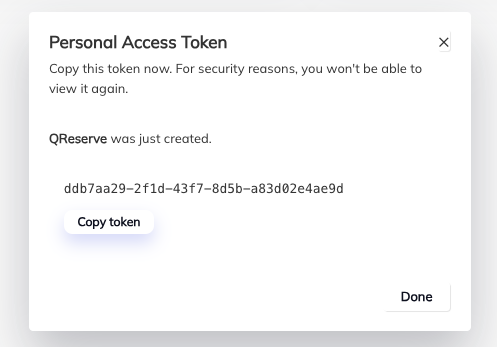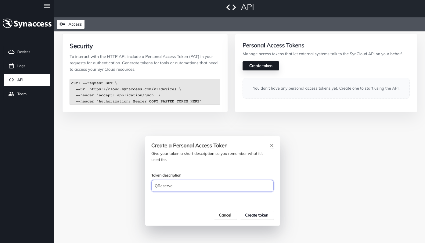 First, create a new Personal Access Token in the Synaccess cloud platform and give it a descriptive name such as "QReserve".