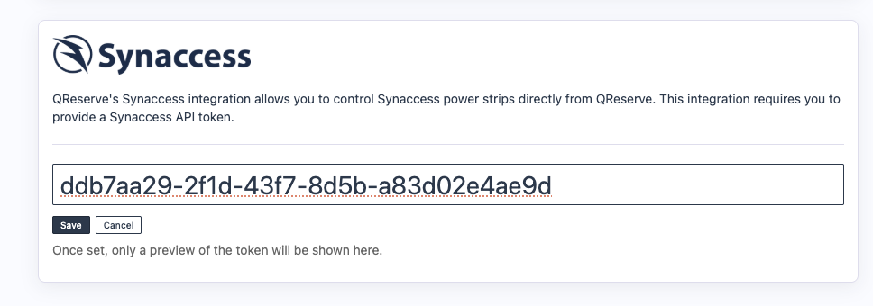 In QReserve, go to Site Settings > Integrations and paste your personal access token into the Synaccess integration box.