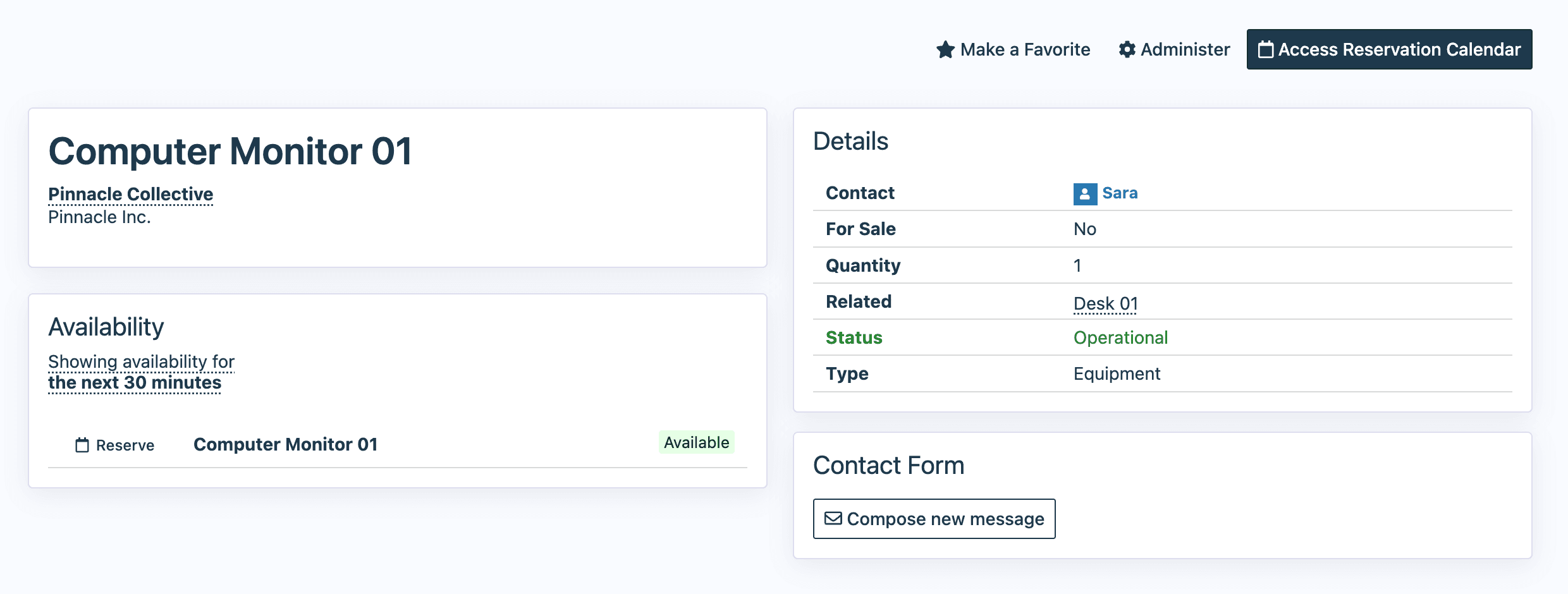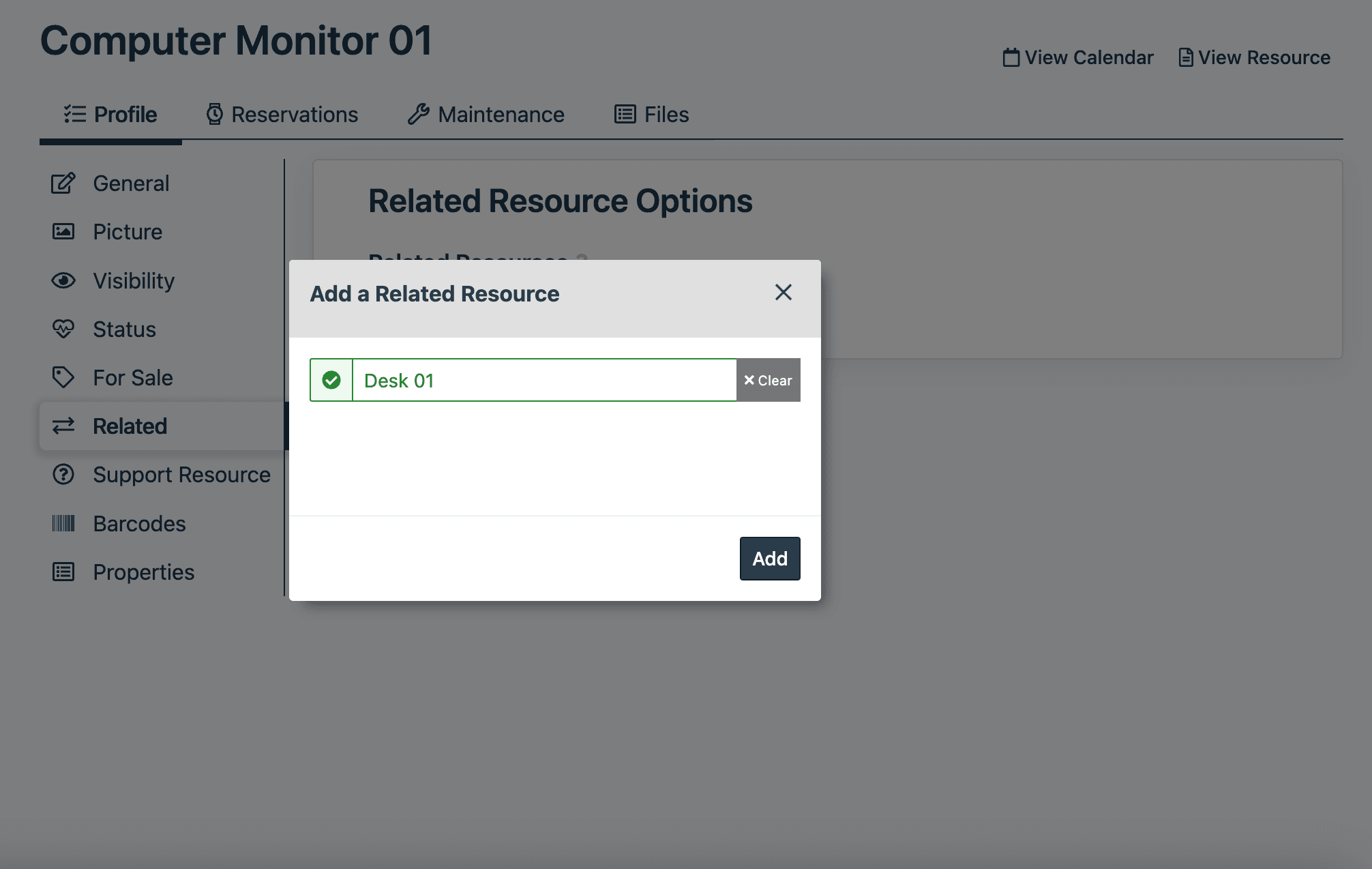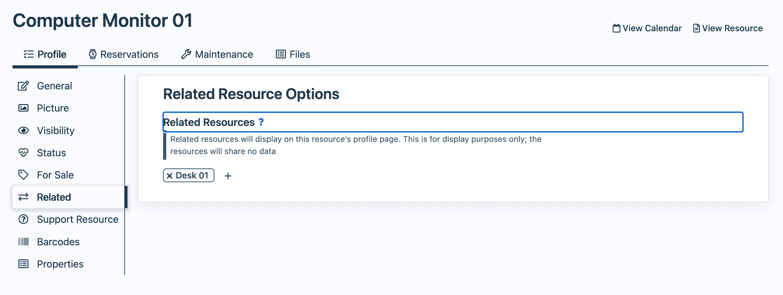 Now, in the user view, on the Computer Monitor 01 resource page, Desk 01 appears as a related resource and the same will happen when on the Desk 01 resource page.